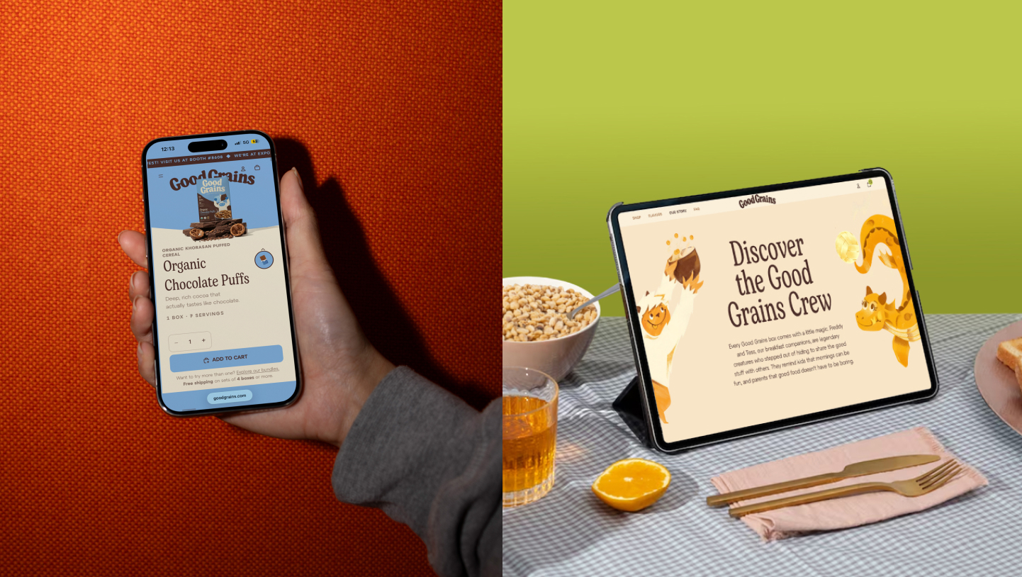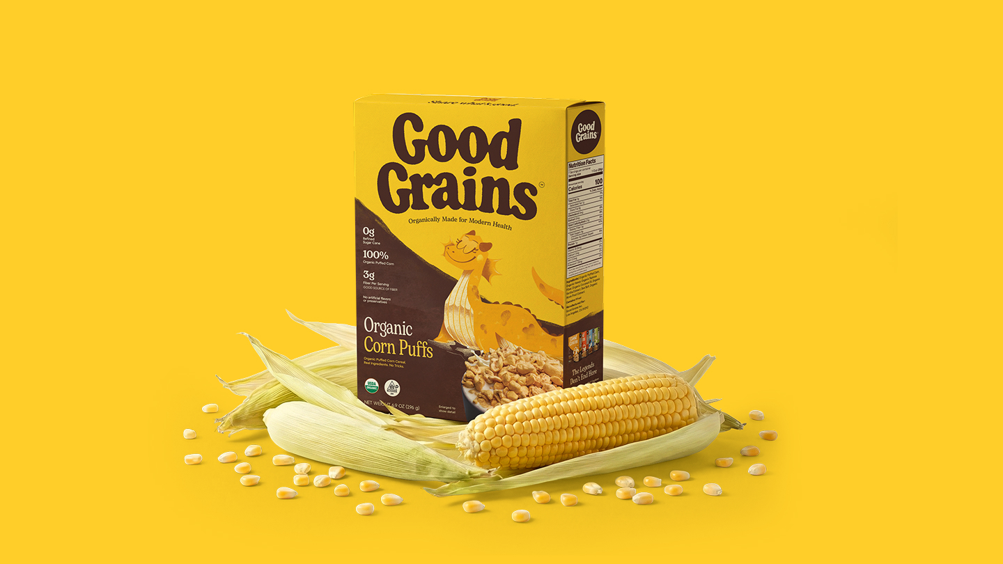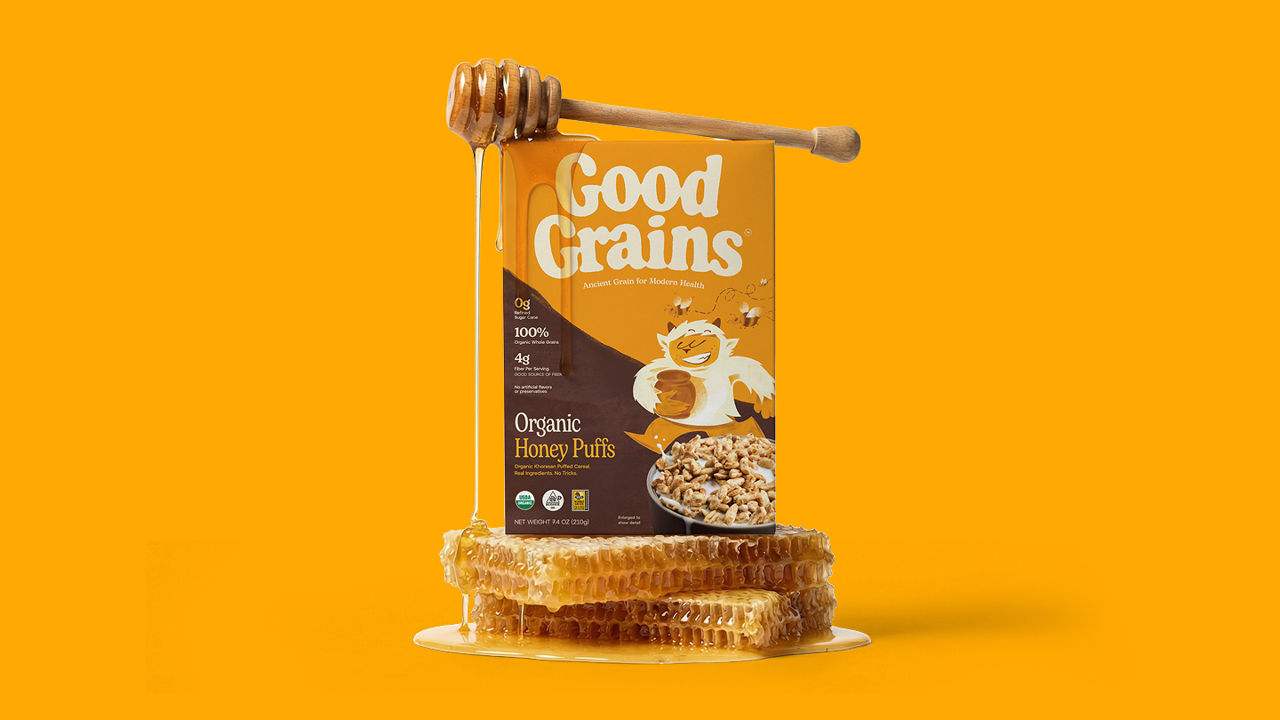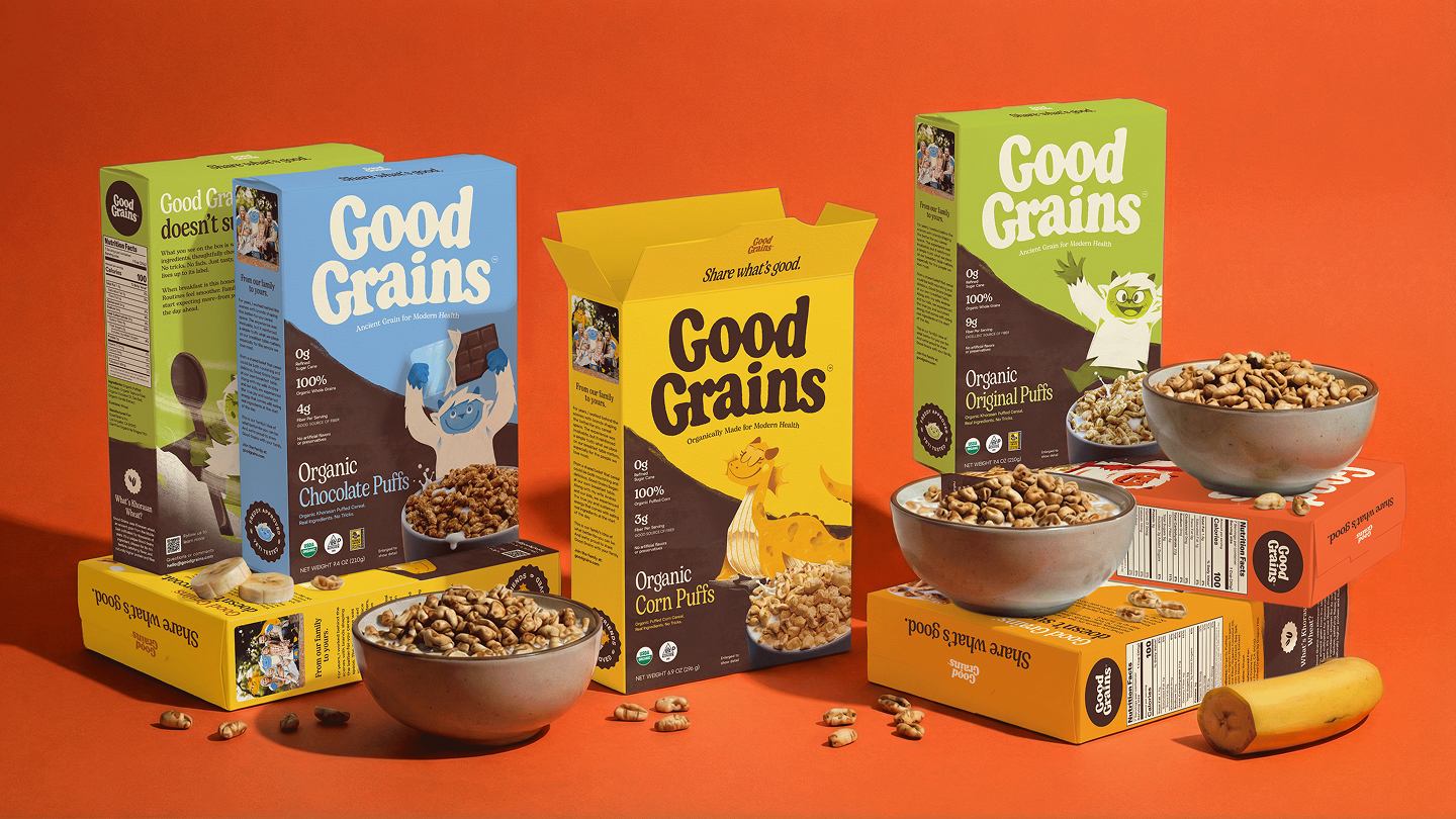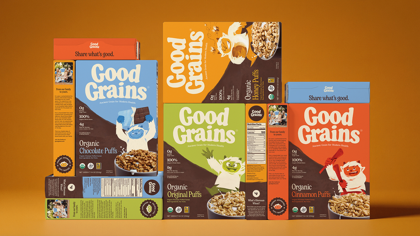 Good Grains was built around a simple belief: cereal should be made from real food, not formulas. The founders came to us with a name already in place and a beloved yeti character they hoped to preserve and reimagine. With Expo West approaching quickly, they needed more than a refresh. Our task was to build a cohesive brand strategy, identity system, packaging, and digital experience that could relaunch the brand with clarity and impact. The cereal aisle is crowded—and increasingly mistrusted. Many families have moved away from the category altogether, skeptical of over-processed ingredients and exaggerated health claims. Good Grains needed to win back the modern household buyer while still engaging kids at the table. We built the brand around bold ingredient transparency, making real ingredients the hero rather than hiding behind marketing claims. Organic khorasan wheat and simple corn puffs became central storytelling elements, supported by a grounded color palette, honest typography, and photography that celebrates real flavor and texture. The reimagined yeti adds warmth and intrigue, balancing trust for parents with playfulness for kids.